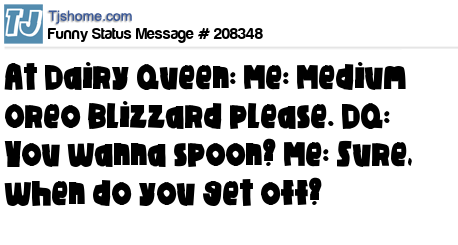 X says At Dairy Queen: Me: Medium Oreo Blizzard please. DQ: You wanna spoon? Me: Sure, when do you get off?