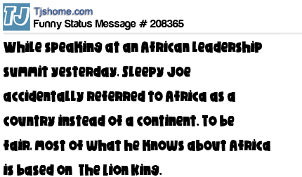 X says While speaking at an African leadership summit yesterday, Sleepy Joe  accidentally referred to Africa as a country instead of a continent. To be fair, most of what he knows about Africa is based on “The Lion King.”