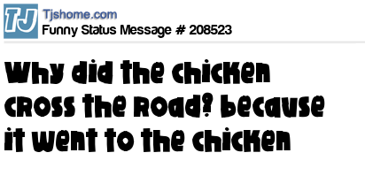 - # 78075 why did the chicken cross the road? "to get to your house"..knock knock..who is there? "the chicken"