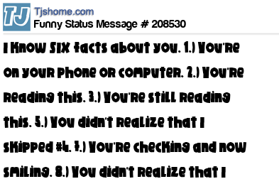 - # 50877 1.You're reading my status. 2.You wanna keep reading. 4. You didn't notice I skipped 3. 5. You're checking. 6. You're smiling.