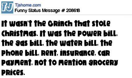 X is It wasn't the Grinch that stole Christmas. It was the power bill, the gas bill, the water bill, the phone bill, rent, insurance, car payment, not to mention grocery prices.