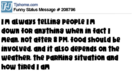 X says I’m always telling people I’m down for anything when in fact I mean, not after 8 PM, food should be involved, and it also depends on the weather, the parking situation and how tired I am