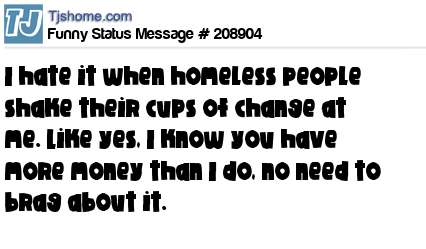 X is I hate it when homeless people shake their cups of change at me. Like yes, I know you have more money than I do, no need to brag about it.