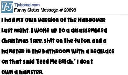 X is I had my own version of the Hangover last night. I woke up to a disassembled Christmas tree, sh!t on the futon, and a hamster in the bathroom with a necklace on that said "Feed Me B!tch." I don't own a hamster.