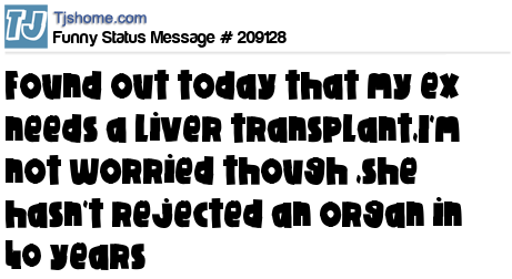 X says Found out today that my ex needs a liver transplant,I'm not worried though ,she hasn't rejected an organ in 40 years