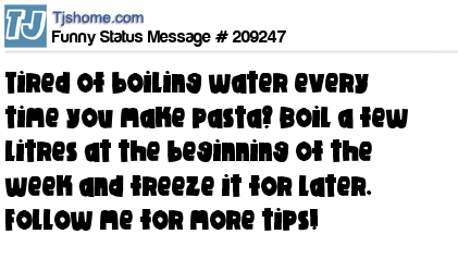 - # 179289 cooking tip: if your tired of always having to boil water everytime you have to make pasta,boil a few gallons at the beginning of the week and freeze it for later.......your welcome!