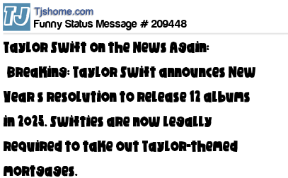 X says Taylor Swift on the News Again: “Breaking: Taylor Swift announces New Year’s resolution to release 12 albums in 2025. Swifties are now legally required to take out Taylor-themed mortgages.