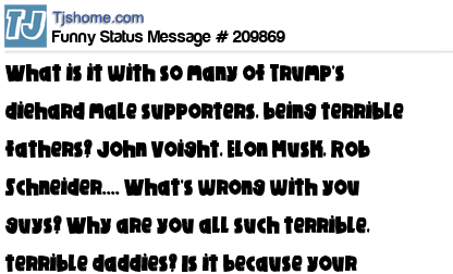 X is What is it with so many of Trump's diehard male supporters, being terrible fathers? John Voight, Elon Musk, Rob Schneider.... What's wrong with you guys? Why are you all such terrible, terrible daddies? Is it because your daddy sucked as well?
