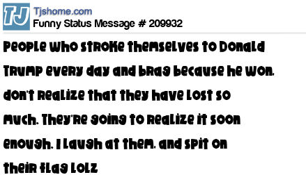 X is People who stroke themselves to Donald Trump every day and brag because he won, don't realize that they have lost so much. They're going to realize it soon enough. I laugh at them, and spit on their flag lolz