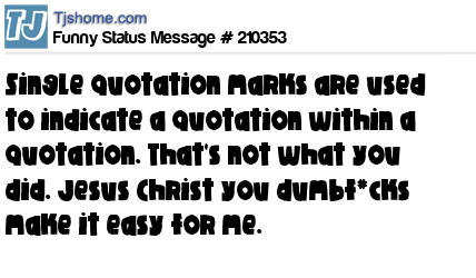 X is Single quotation marks are used to indicate a quotation within a quotation. That's not what you did. Jesus Christ you dumbf*cks make it easy for me.