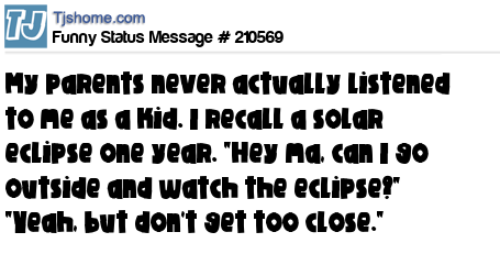 - # 67248 Did you guys ever get the idea while growing up that your parents never really listened to you? One time I asked my mom if I could go outside and watch the solar eclipse and she goes, "Okay, but don't get too close."