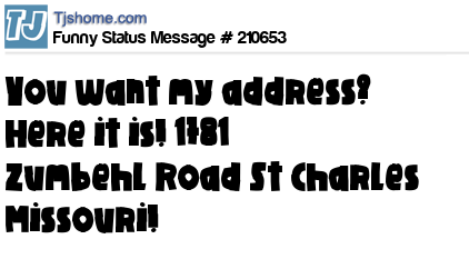 X is You want my address? Here it is! 1781 Zumbehl Road St Charles Missouri!