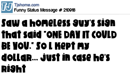 - # 186050 There was a homeless man I was going to give a dollar to untill I read the sign he was holding that read "One day this could be you." So I put the dollar back in my pocket in case he may be right.