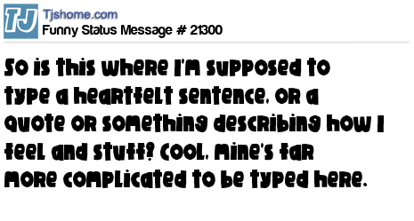 X  So is this where I'm supposed to type a heartfelt sentence, or a quote or something describing how I feel and stuff? Cool, mine's far more complicated to be typed here.