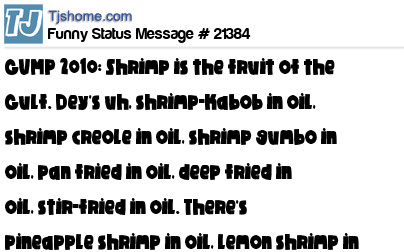X GUMP 2010: Shrimp is the fruit of the Gulf. Dey's uh, shrimp-kabob in oil, shrimp creole in oil, shrimp gumbo in oil, pan fried in oil, deep fried in oil, stir-fried in oil. There's pineapple shrimp in oil, lemon shrimp in oil, thats about it.