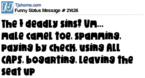 - # 77476 the 7 deadly sins? ummmm....male camel toe, double dipping, backseat driving, gossiping, donkey punching, stink and not having a bell on your bike