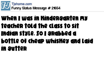 - # 91815 When I was in kindergarten my teacher told me to sit indian style. So I bought a bottle of cheap whiskey and laid in the gutter.