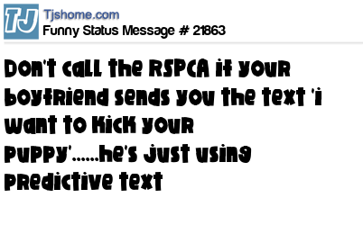 - # 7711 says don't ring the RSPCA if your boyfriend says he wants to kick your puppy... he's just using predictive text