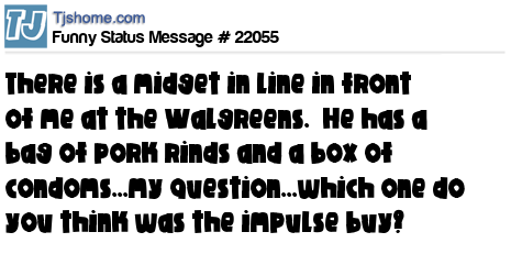 X is there is a midget in line in front of me at the Walgreens. He has a bag of pork rinds and a box of condoms...my question...which one do you think was the impulse buy?