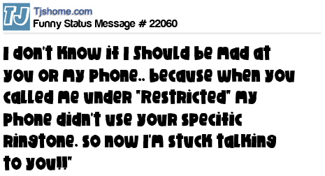 X is I don't know if I Should be mad at you or my phone.. because when you called me under "Restricted" my phone didn't use your specific ringtone. so now I'm stuck talking to you!!"