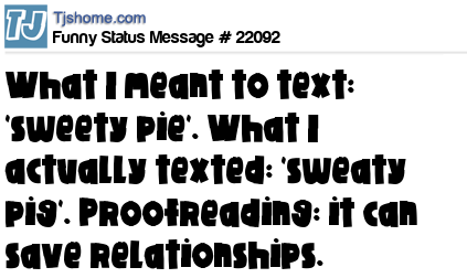X What I meant to text: 'sweety pie'. What I actually texted: 'sweaty pig'. Proofreading: it can save relationships.