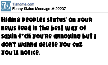 - # 202249 Hiding people's status' on your news feed is the best way of sayin' fck you're annoying but, I don't wanna delete you cuz' you'll notice.