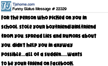 X For the person who picked on you in school, stole your boyfriend/girlfriend from you, spread lies and rumors about you, didn't help you in anyway possible....all of a sudden......wants to be your friend on Facebook.
