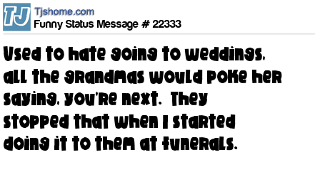 - # 56803 Old aunts used to come up to me at weddings, poke me in the ribs and cackle, telling me, "You're next." They stopped after I started doing the same thing to them at funerals.