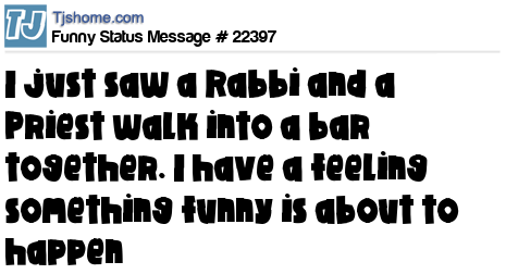 X I just saw a Rabbi and a Priest walk into a bar together. I have a feeling something funny is about to happen