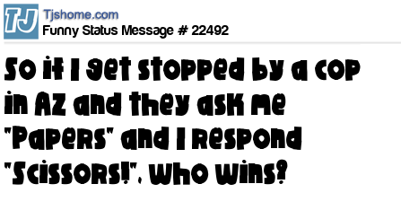 X says So if I get stopped by a cop in AZ and they ask me "Papers" and I respond "Scissors!", who wins?