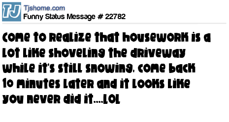 X has come to realize that housework is a lot like shoveling the driveway while it's still snowing, come back 10 minutes later and it looks like you never did it....LOL