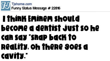 - # 169238 I think Eminem should become a dentist just so he can say "snap back to reality, oh there's a cavity."