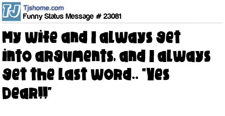 X  My wife and I always get into arguments, and I always get the last word.. "Yes Dear!!"