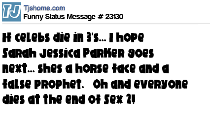 X is If celebs die in 3's... I hope Sarah Jessica Parker goes next... shes a horse face and a false prophet.   Oh and everyone dies at the end of Sex 2!