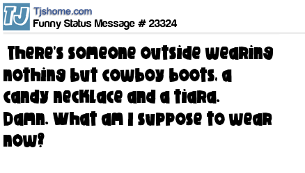 X There's someone outside wearing nothing but cowboy boots, a candy necklace and a tiara. Damn. What am I suppose to wear now?