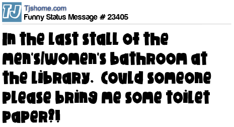 X is in the last stall of the men's/women's bathroom at the library. Could someone please bring me some toilet paper?!