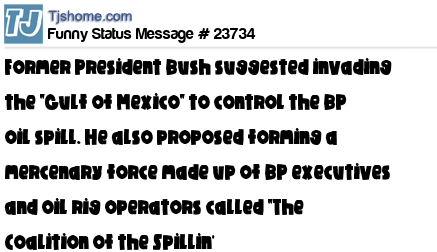 X Former President Bush suggested invading the "Gulf of Mexico" to control the BP oil spill. He also proposed forming a mercenary force made up of BP executives and oil rig operators called "The Coalition of the Spillin'