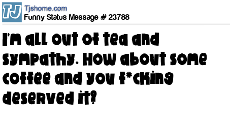 X I'm all out of tea and sympathy. How about some coffee and you f*cking deserved it?