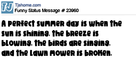 X A perfect summer day is when the sun is shining, the breeze is blowing, the birds are singing, and the lawn mower is broken.