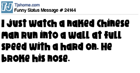 - # 53636 I just watch a damn naked Chinese man run into a wall at full speed with a hard on. He broke his nose.