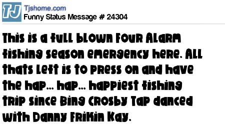 X is This is a full blown Four Alarm fishing season emergency here. All thats left is to press on and have the hap... hap... happiest fishing trip since Bing Crosby Tap danced with Danny Frikin Kay.