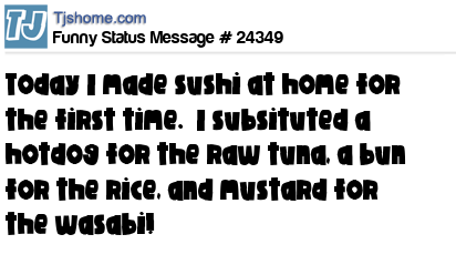 X Today I made sushi at home for the first time. I subsituted a hotdog for the raw tuna, a bun for the rice, and mustard for the wasabi!