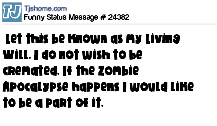 X Let this be known as my Living Will. I do not wish to be cremated. If the Zombie Apocalypse happens I would like to be a part of it.