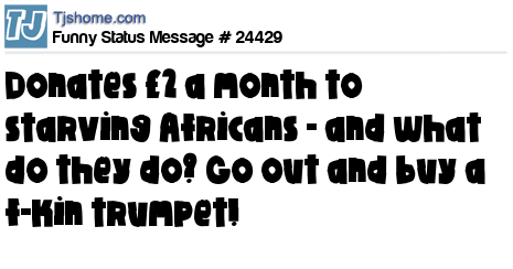 X  donates £2 a month to starving Africans - and what do they do? Go out and buy a f-kin trumpet!