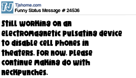X Still working on an electromagnetic pulsating device to disable cell phones in theaters. For now, please continue making do with neckpunches.