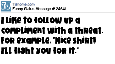 X I like to follow up a compliment with a threat. For example, "Nice shirt! I'll fight you for it."