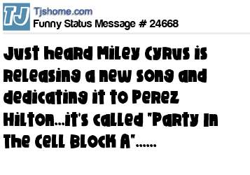 X is just heard Miley Cyrus is releasing a new song and dedicating it to Perez Hilton...it's called "Party In The Cell Block A"......