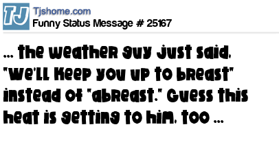 X ... the weather guy just said, "We'll keep you up to breast" instead of "abreast." Guess this heat is getting to him, too ...