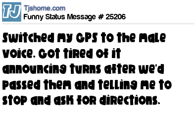 X Switched my GPS to the male voice. Got tired of it announcing turns after we'd passed them and telling me to stop and ask for directions.