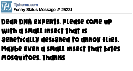 X Dear DNA experts, please come up with a small insect that is genetically designed to annoy flies. Maybe even a small insect that bites mosquitoes. Thanks